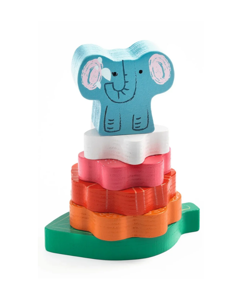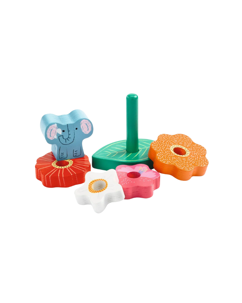 Puzz & Stack is an easy-to-assemble wooden puzzle and stacking game. The flowers stack onto the wooden peg to form a pretty flower pyramid with a little elephant on top.