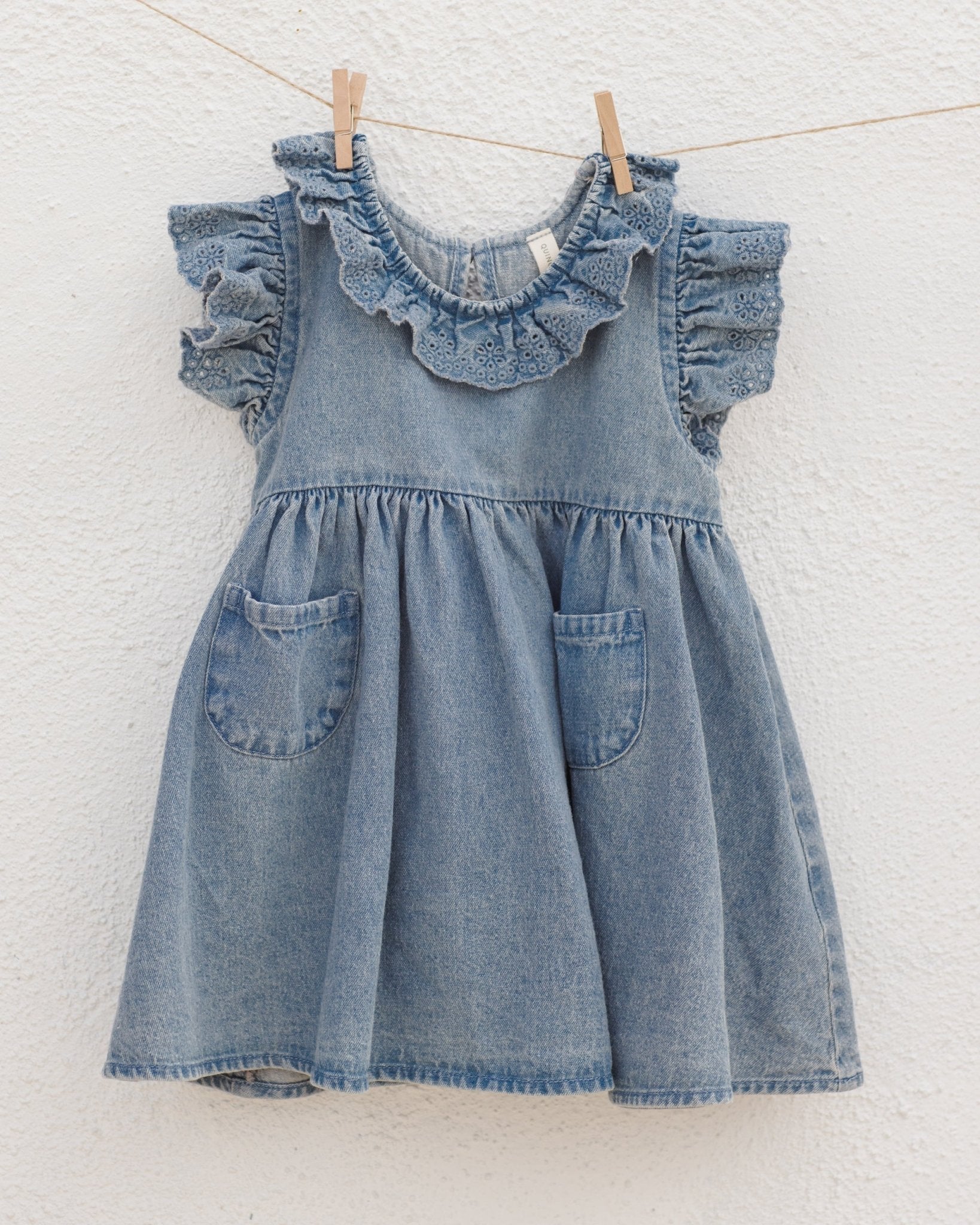 Crafted from 100% organic cotton, this lightweight denim dress blends timeless style with breathable comfort. Featuring delicate eyelet ruffles and functional pockets, it’s the ultimate play-ready outfit for sunny days.