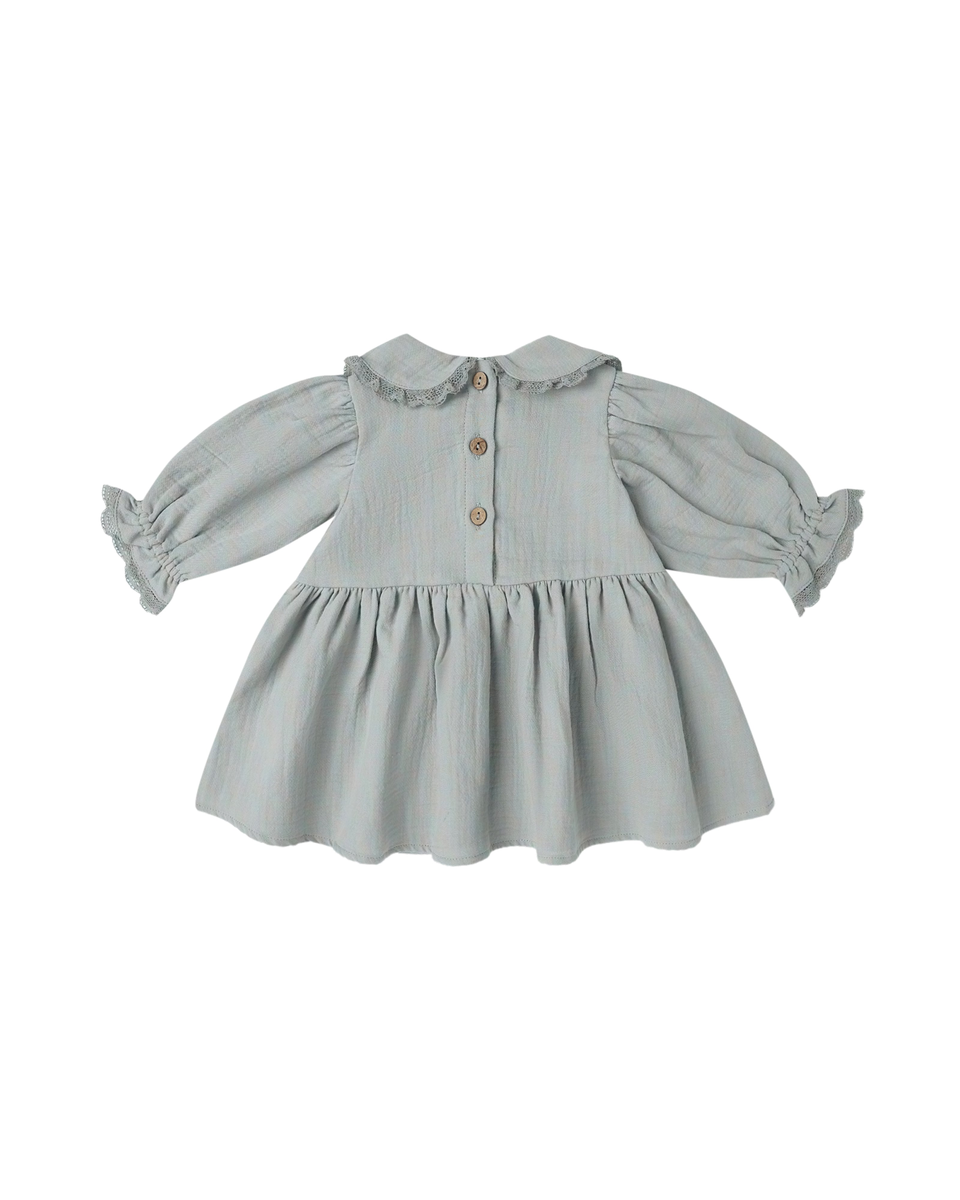 Our Marisol Dress features a Peter Pan collar, patch pockets, and full gathered sleeves—all adorned with delicate lace ruffle trim—and coconut buttons at the back for easy dressing. Coordinating bloomers included with all sizes.