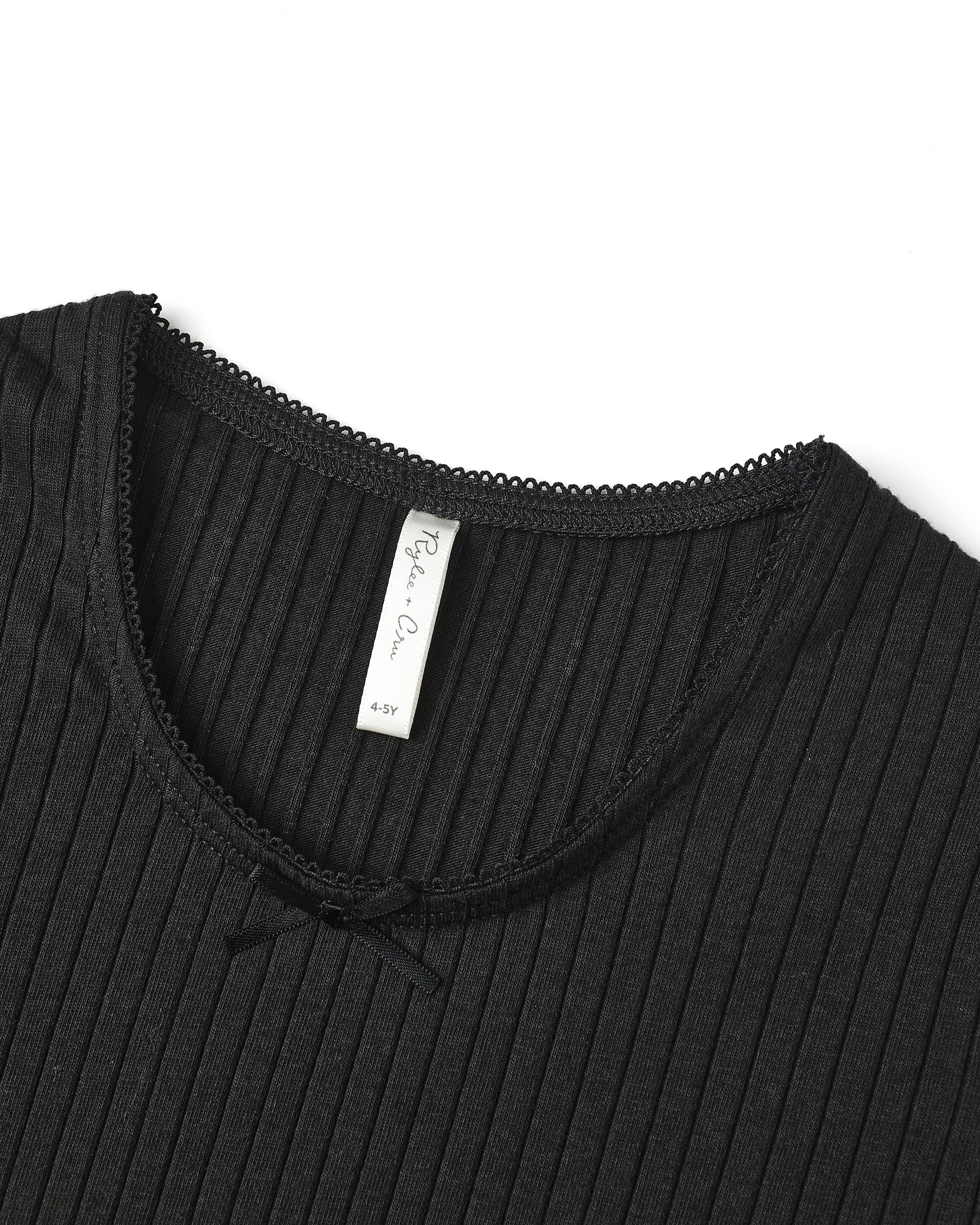 Ribbed Long Sleeve top featuring a delicate lettuce edge hem, lace-trimmed neckline, and a sweet satin bow.