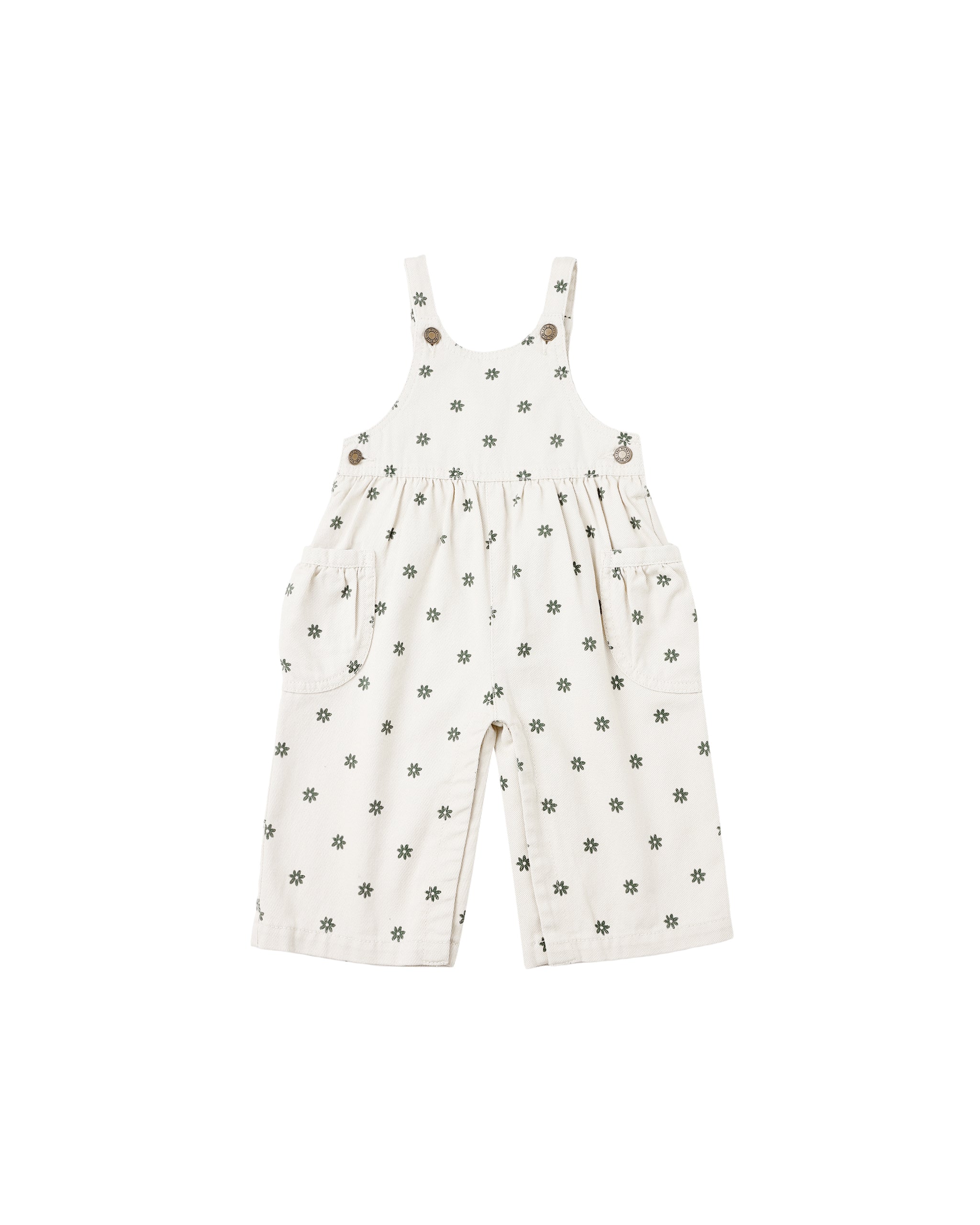 Bringing effortless style, these wide leg overalls feature classic prints, gathered patch pockets, and antique brass buttons and snaps.
