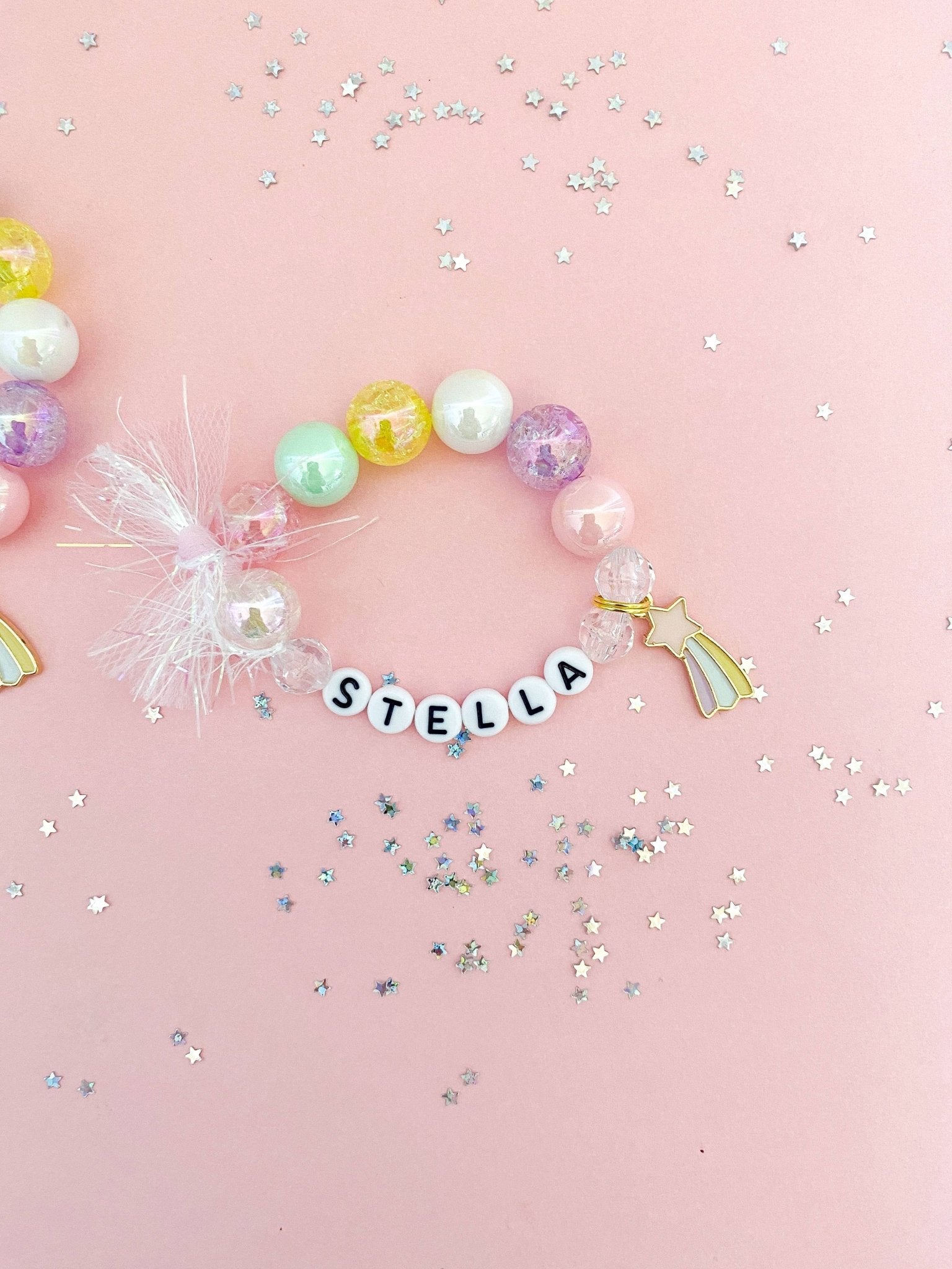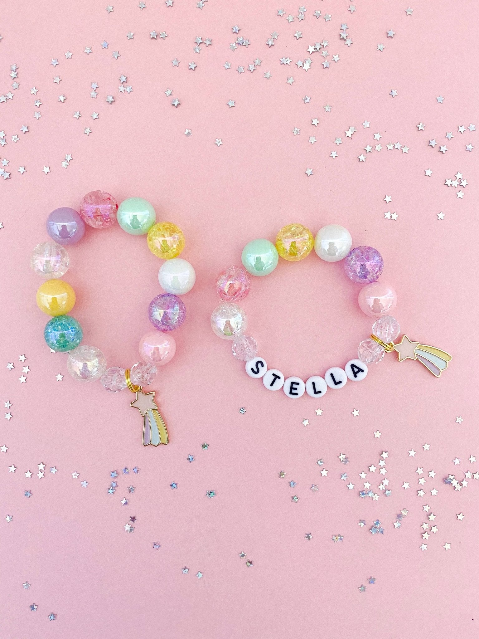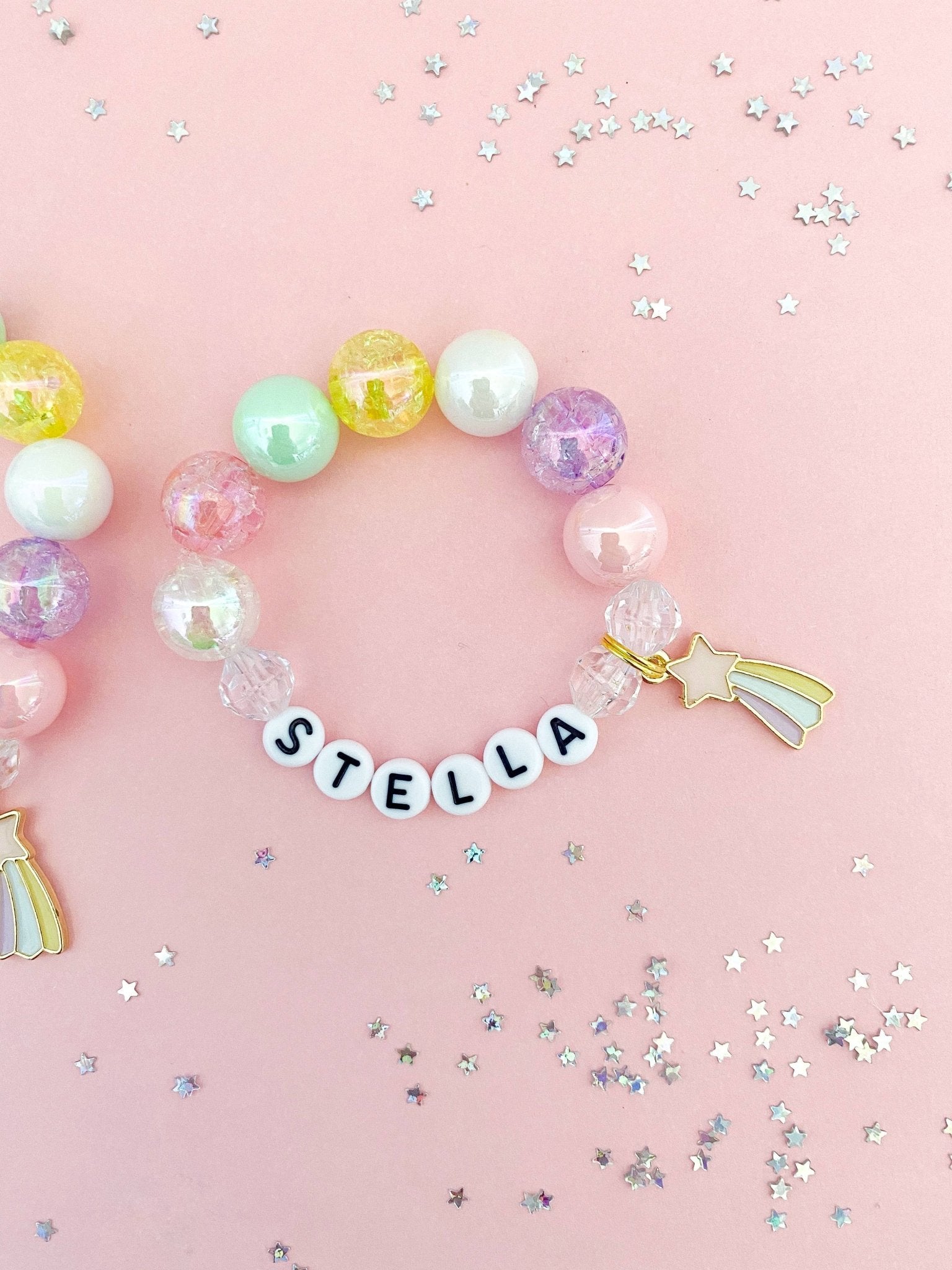 Bracelet made with 8mm and 12mm acrylic beads and one enamel charm strung on stretch cord. Tulle knot and sparkle optional Bracelet Sizing: Toddler 5.5" Child: 6" Big Kid: 6.5" Choose personalized or non personalized. *Beads in bracelet may vary depending on length of name and size of bracelet. *Specify personalization (if desired) Handle our jewelry with care. Keep away from water, lotions and cosmetics. Our jewelry contains small parts and is designed for kiddos 3 and up. Never leave children unattended while wearing jewelry.
