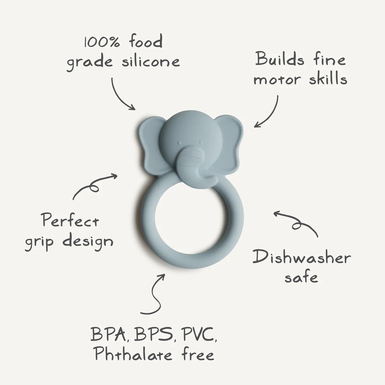 Help soothe your baby's irritated gums with our line of teethers. Made from 100% non-toxic, food-grade silicone, and designed to be easy to grasp by tiny fingers, our elephant teethers are safe for your baby to use. Their playful design and sophisticated colors make them a stylish addition to your home.
