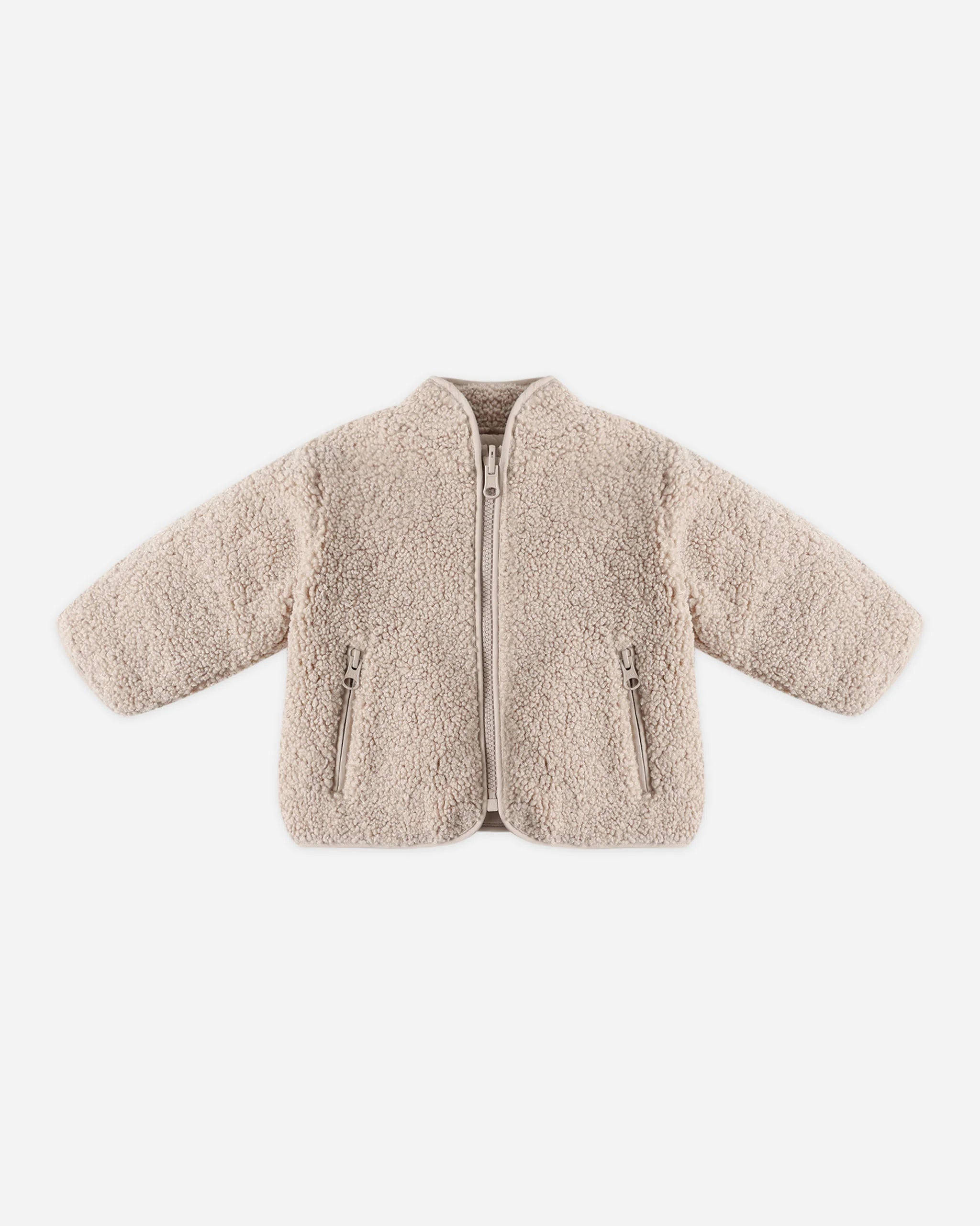 Keep your little ones warm and cozy with this shearling zip up jacket. Zipper along the center front, and is also reversible. With functional front zippers as well.