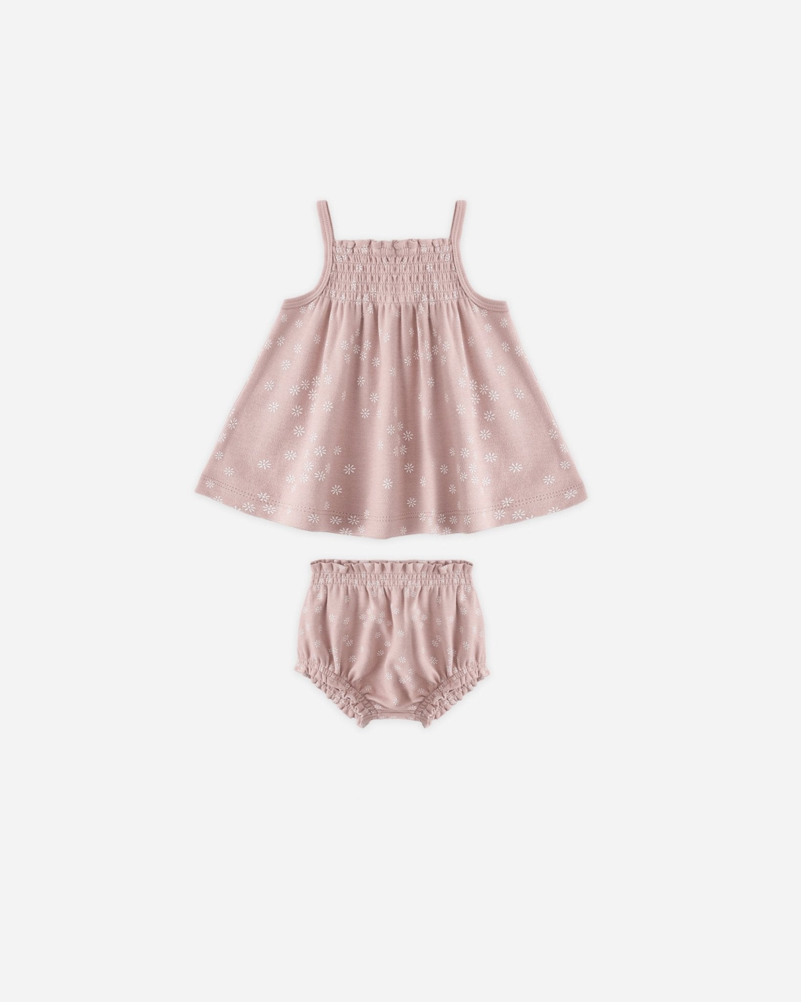 Embrace effortless spring style with this 100% organic cotton smocked tank and bloomer set. Featuring a delicate mauve daisy print, it’s the perfect blend of sustainable comfort and charming play-ready design.