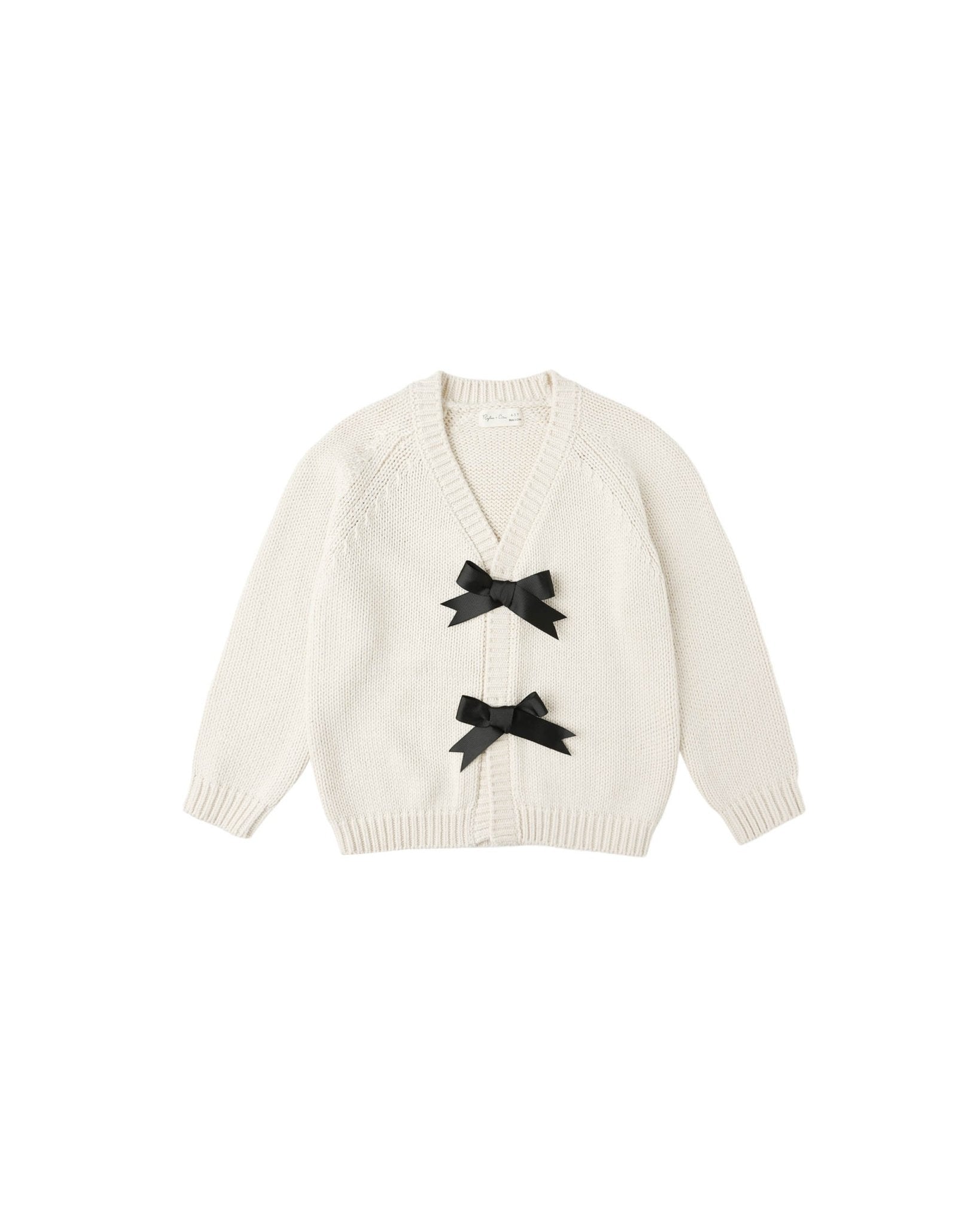 V-neck cardigan with relaxed raglan sleeves and a two-button placket accented by fixed bows for a sweet, gentle touch.