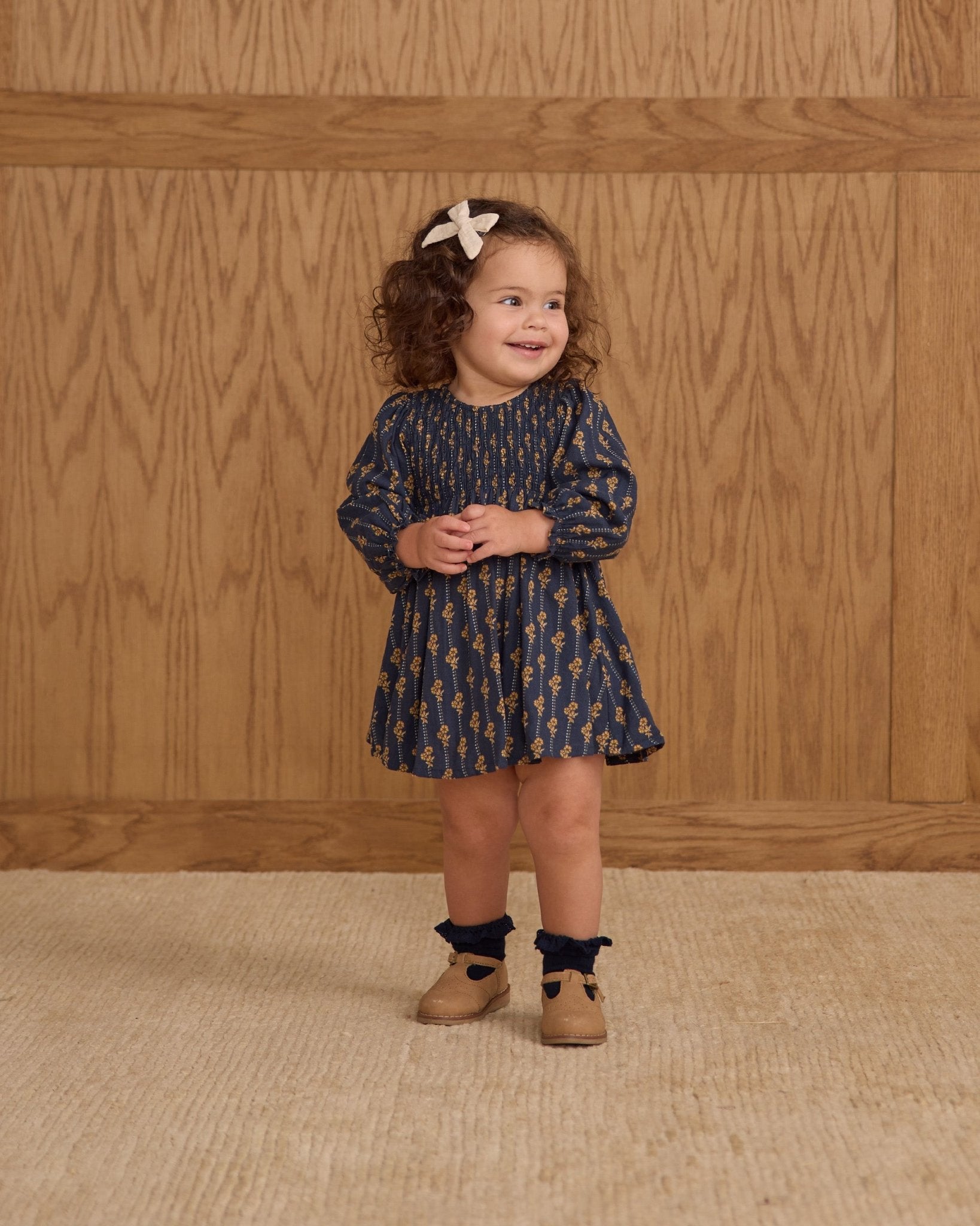 Our long sleeve Capri Dress features a darling smocked bodice and a flowy skirt. Coordinating bloomers included with sizes 0-3M - 18-24M.