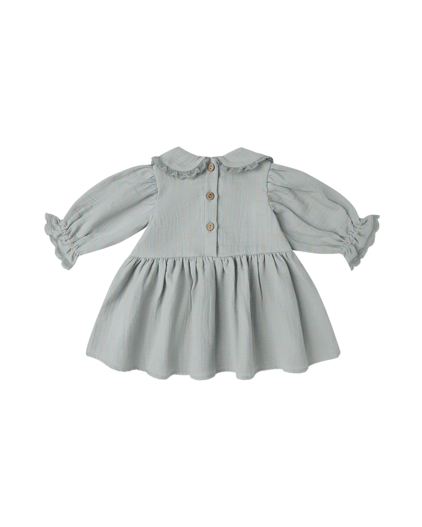 Our Marisol Dress features a Peter Pan collar, patch pockets, and full gathered sleeves—all adorned with delicate lace ruffle trim—and coconut buttons at the back for easy dressing. Coordinating bloomers included with all sizes.