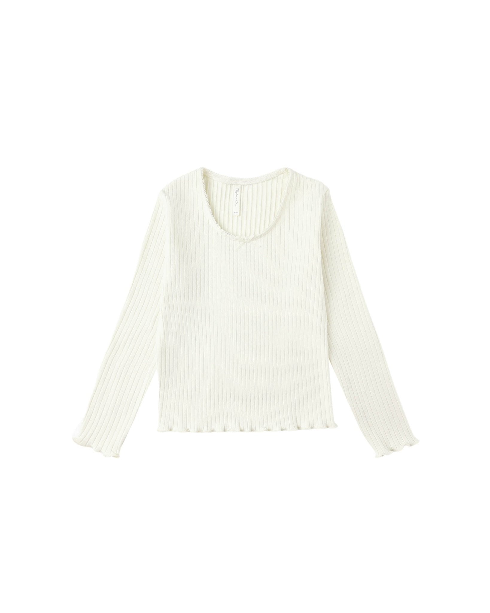 Ribbed Long Sleeve top featuring a delicate lettuce edge hem, lace-trimmed neckline, and a sweet satin bow.