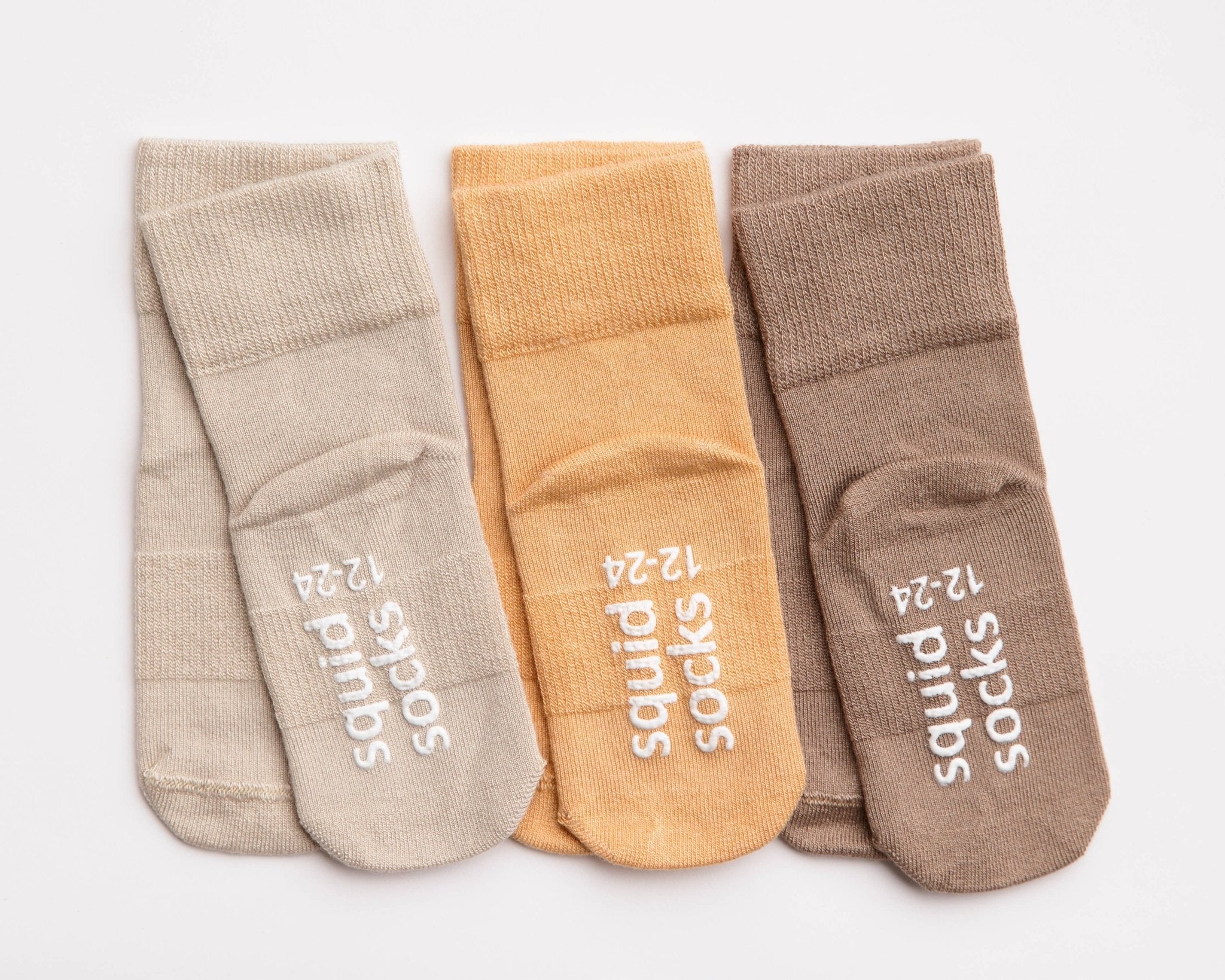 - Colors: Toffee, Butterscotch, Coffee Bean Brown - 1 pack of 3 pairs on horizontal hanging header card for easy display with UPC sticker on back - 100% silicone dots on inside cuff gently hold socks in place - Silicone grips with size callouts on the bottom of sizes 6-12+ help prevent slips and falls - 85% viscose made from bamboo, 12% nylon, 3% spandex - Moisture wicking and temperature control properties - Buttery soft with hypoallergenic properties - Super absorbent and keeps tiny feet drier - Pre-washed - Seamless toe - Breathable - Squid Fit Technology- elastic bands in the cuff and around the foot's top and bottom arch for added comfort and flexibility - Standard 100 OEXO-TEX - Gift, gift giving, baby shower - As seen on Shark Tank Every baby is unique, so here’s a few things we recommend: - Check baby's skin periodically when introducing Squid Socks - Avoid overnight use, unless placing socks over pants/leggings - Discontinue use if irritation occurs